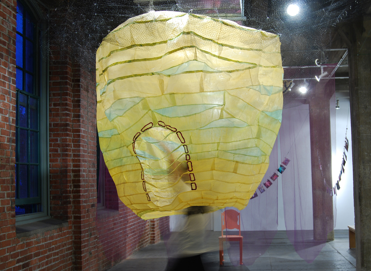 fabric, rabbit skin glue and pigment, acrylic, photographs, deer netting, plastic, plastic drinking straws, wooden chair
