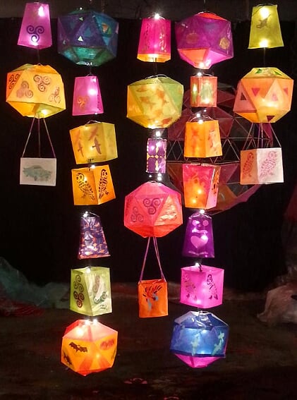 2015, kite paper with stencils, wire, string lights, 7' x 5' installation, made in collaboration with clients at New Courtland Germantown LIFE.